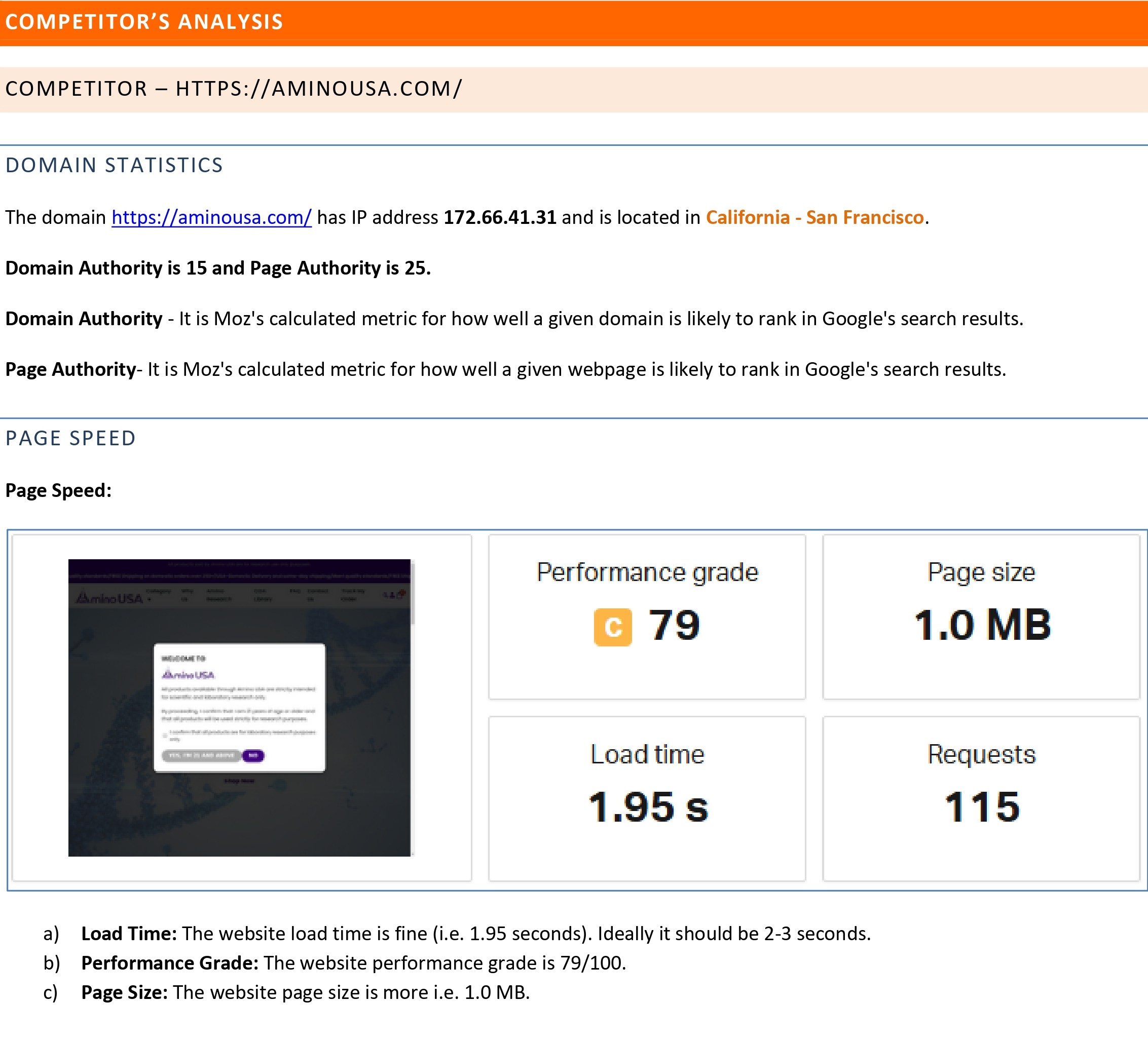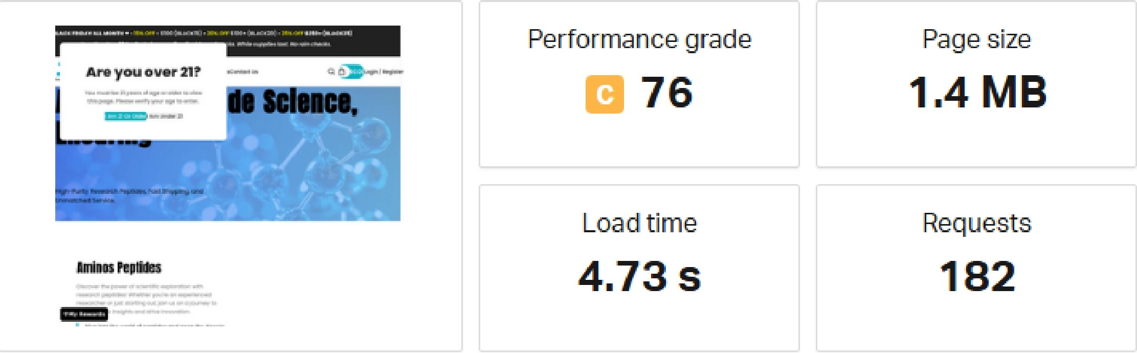 We analyze page speed, load time, page size, and overall performance grade.