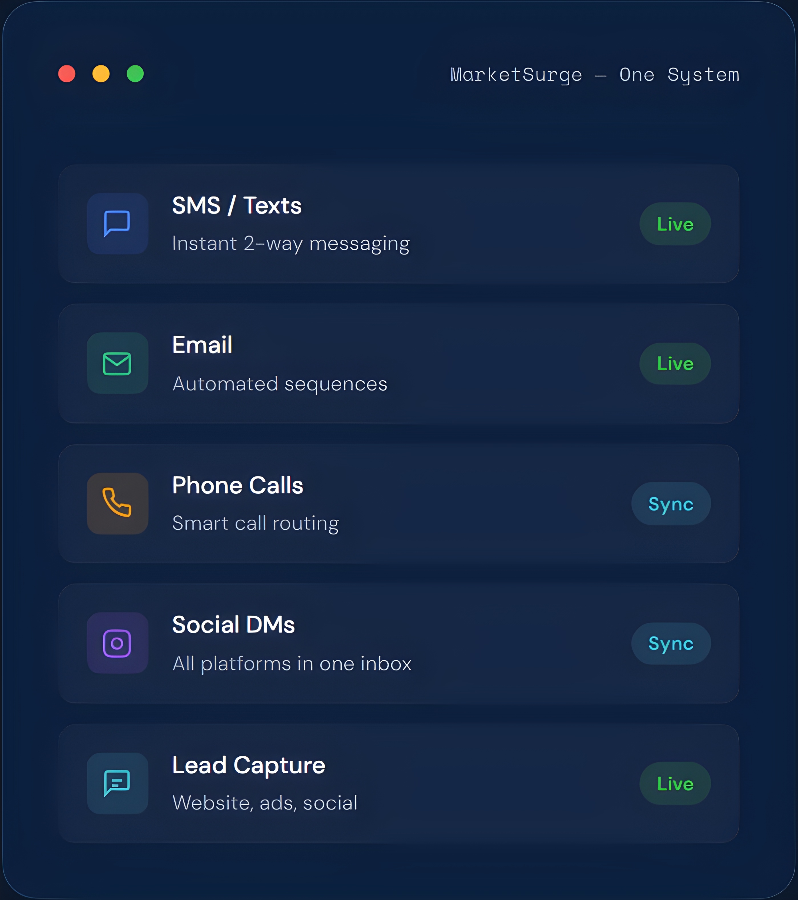 MarketSurge brings your marketing, sales, and communication into one place—so nothing falls through the cracks.